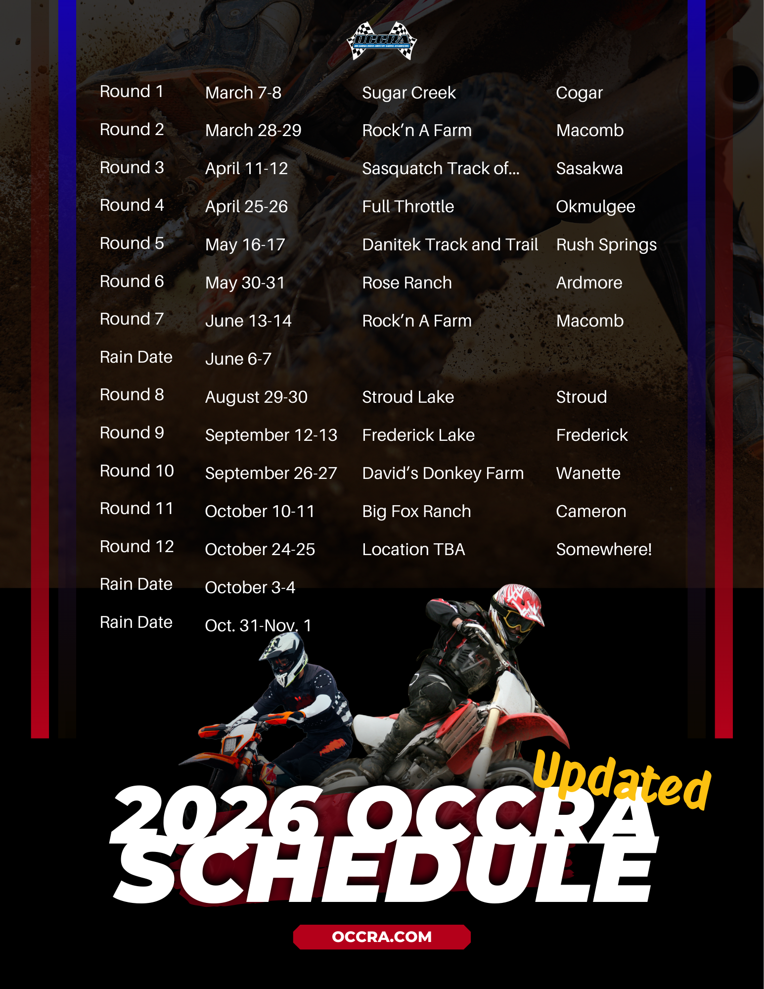 Experience Oklahoma Off-Road Racing with OCCRA. We offer competitive cross country motorcycle racing and Strider bike classes for all ages. Whether you’re tackling our long-course hare scrambles or short-course sprints, riders can sign up for single or multiple racing classes to maximize their track time.